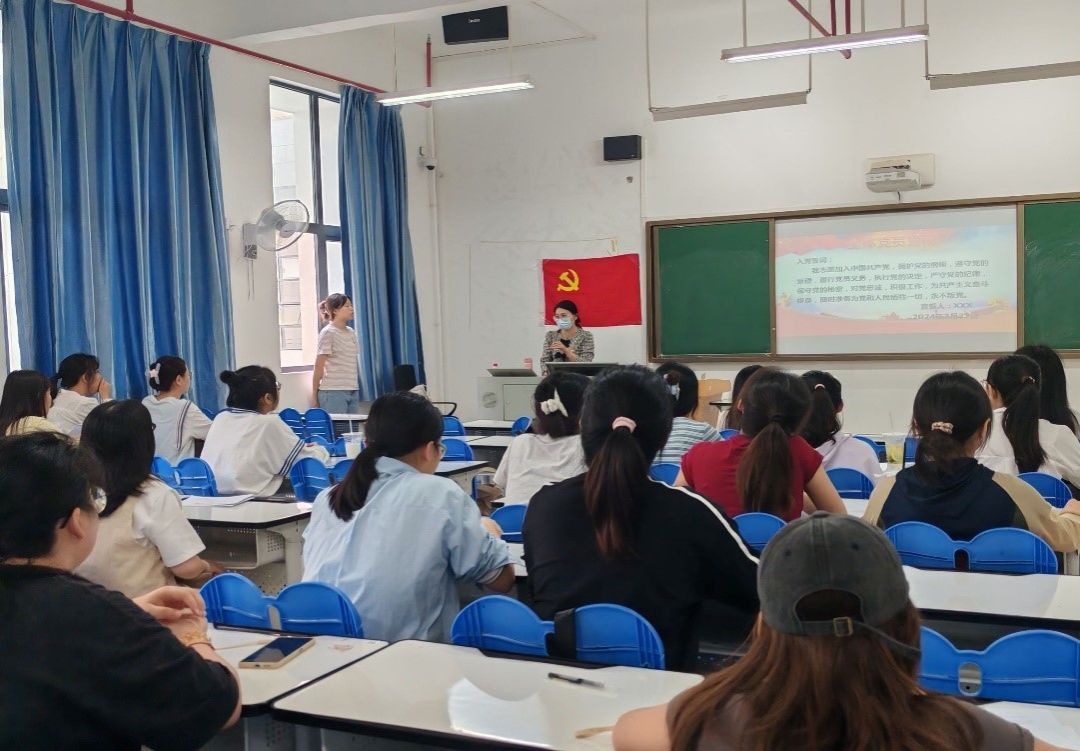 会议第一项,由发展对象庞诗琳等3名同志逐一汇报对党的认识、入党动机、本人履历、家庭成员和主要社会关系情况以及向党组织说明其他问题。会议第二项,由党支部支委吴文献同志对庞诗琳等3名同志的政审情况作报告,经党支部研究、学校党委预审,符合程序,材料齐全。会议第三项,由入党介绍人介绍庞诗琳等3名发展对象的真实情况,并对其能否入党表明意见。会议第四项,与会的中共党员对庞诗琳等3名发展对象能否接收为中共预备党员进行充分讨论并发表意见,之后,拥有表决权的中共正式党员对发展对象逐一投票表决。在座的中共党员认为这3名发展对象均符合中共预备党员标准,经投票表决,同意接收庞诗琳等3名发展对象为中共预备党员。会议第五项,全体党员起立宣读入党誓词。党支部书记蒋欢老师最后对大会进行了总结,强调了支部纪律,希望新发展的预备党员要时刻做到以一名合格的中共预备党员身份严格要求自己,遵守党的章程,以实际行动加强自身党性修养。