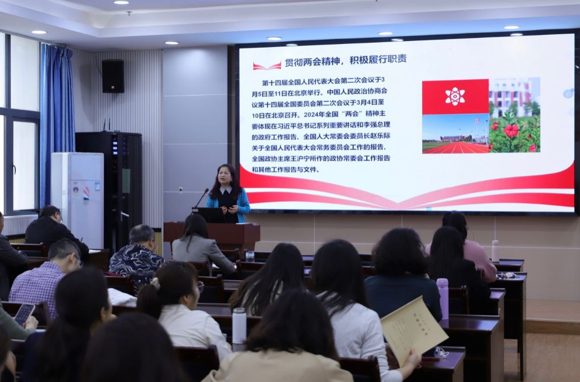 本次政治理论学习会的主题是由学院党委庞芳书记主讲的“深入学习贯彻2024年全国两会精神”。庞芳书记以今年全国两会为出发点,带领全体教职工深入学习了两会精神以及习近平总书记全国两会重要讲话精神。