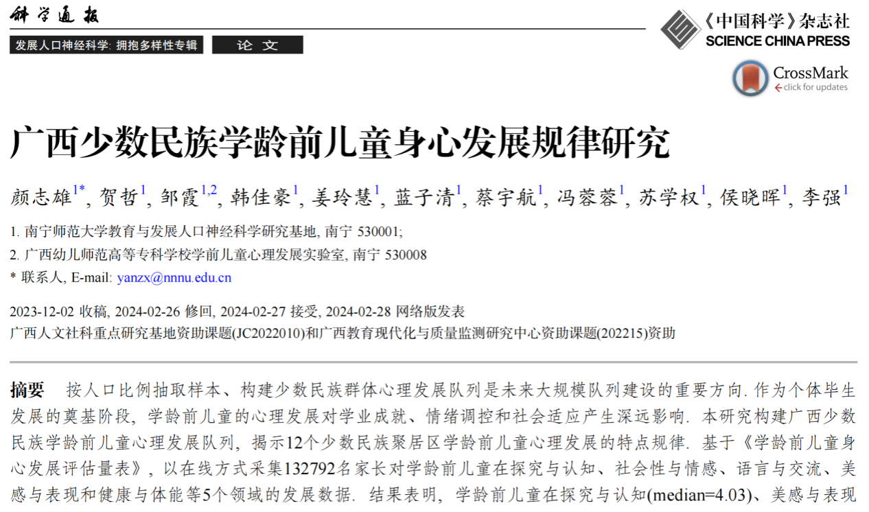为第一署名单位在《科学通报》发展人口神经科学: 拥抱多样性专辑上发表题为“广西少数民族学龄前儿童身心发展规律研究”的研究论文。