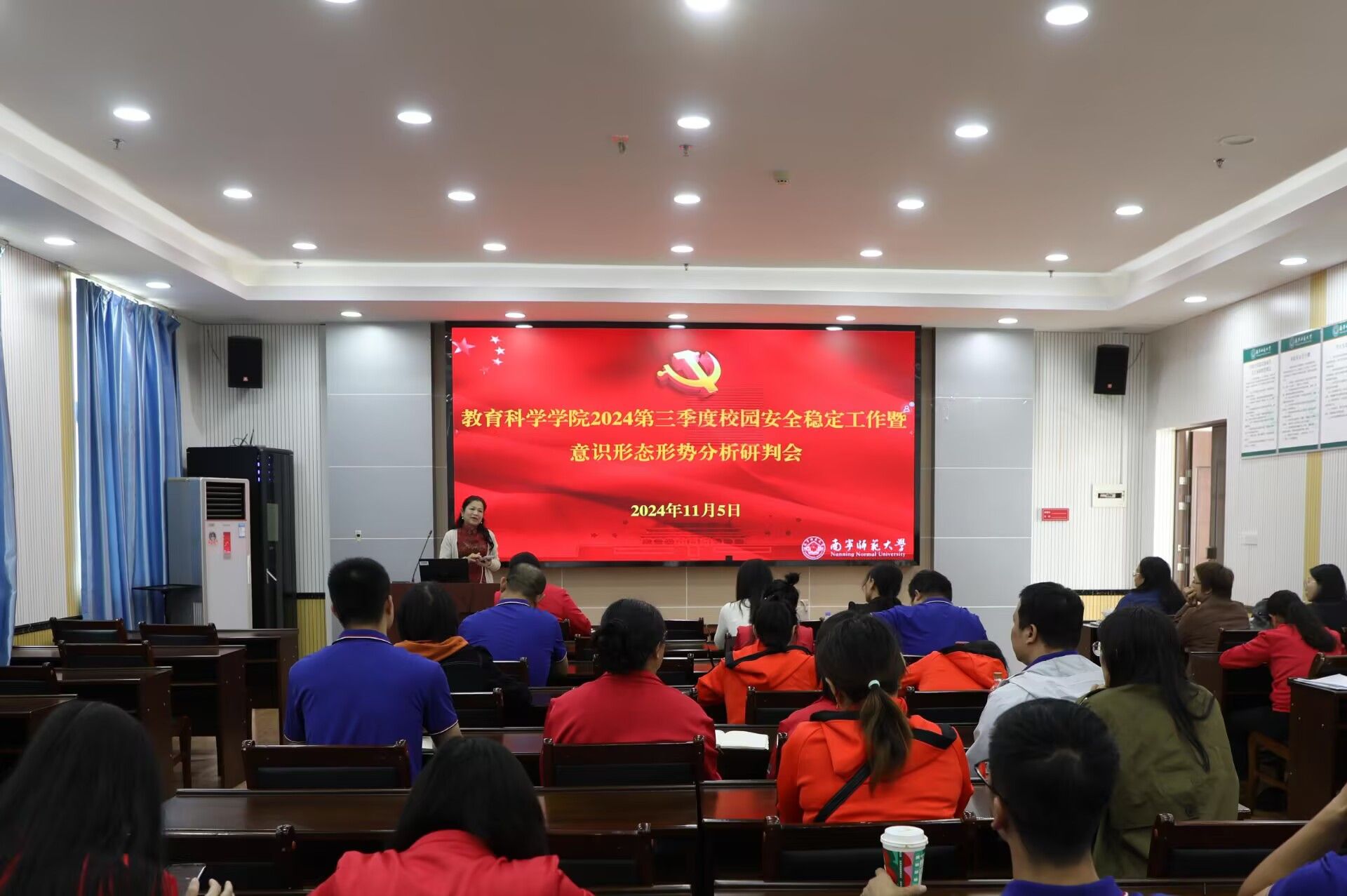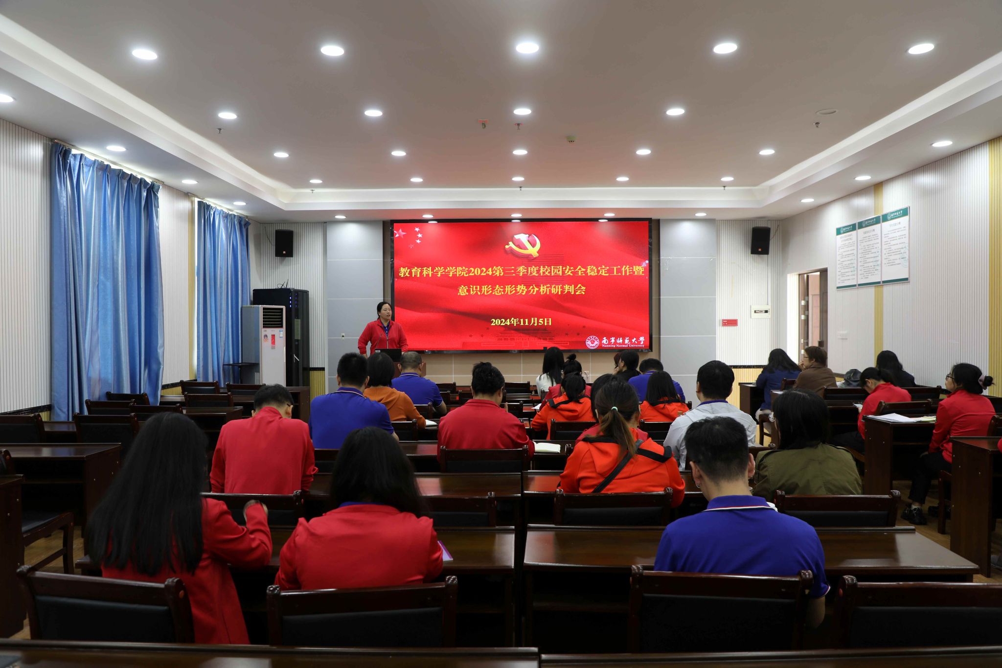 在五合校区理综楼1003会议室召开了2024年第三季度校园安全稳定工作暨意识形态形势分析研判会。学院党委书记庞芳、副书记谢珊,各党支部书记、教工支委,全体研究生、本科生班主任参加会议。