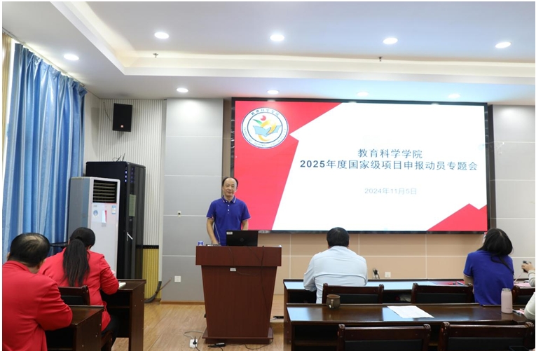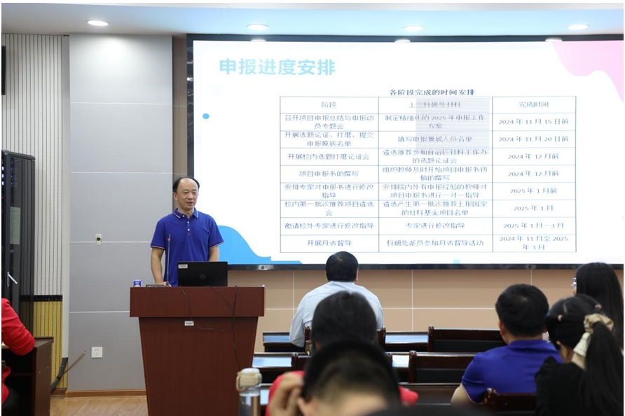 徐延宇副院长对学院2024年各级各类项目申报立项进行了总结梳理,分析了申报工作中存在问题,总结了一些有效的做法。针对2024年度申报工作中存在的不足,徐延宇副院长提出,2025年的国家级项目申报要紧密围绕国家重大战略需求,结合研究方向,积极开展科研创新,要根据实际牵头申报或作为成员参与,鼓励新引进博士积极申报,广泛宣传与重点动员相结合,强化精细化管理等加强组织领导的措施。最后,结合学院申报国家级项目的工作进度和学校要求,提出了时间表、路线图,为2025年取得更好的成绩做好充分准备。