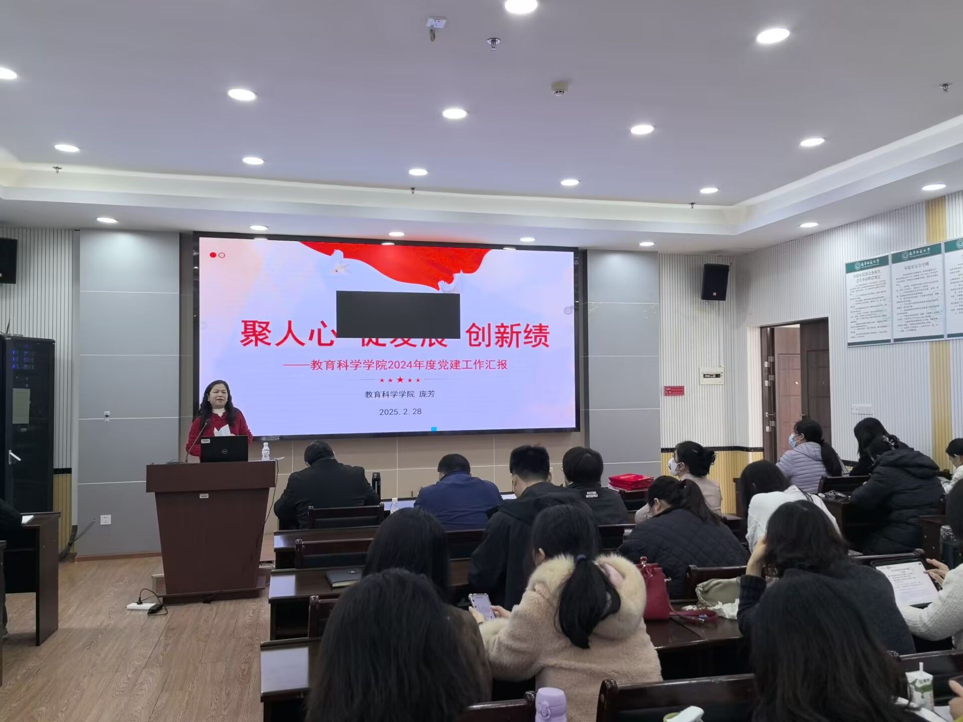 学院党委书记庞芳作了题为《聚人心 促发展 创新绩》的工作报告,对2024年学院党委工作进行了回顾,勉励党员教师在新学期不断开拓创新,助力学院发展。她还介绍了学院现阶段就业创业工作的情况,部署了下一步重点工作,要求全体教职工都要参与到学院的就业创业工作中。