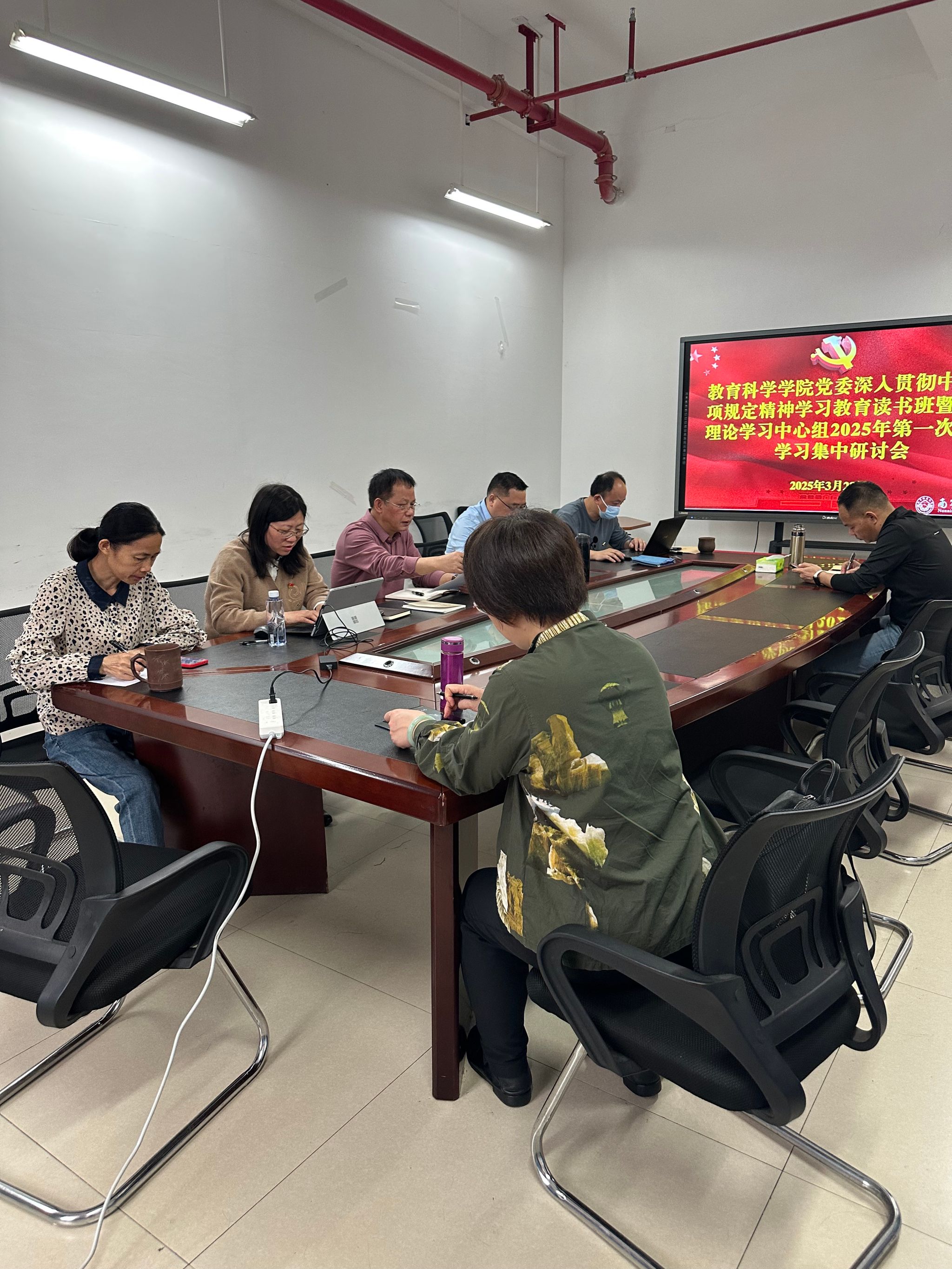 党委召开深入贯彻中央八项规定精神学习教育读书班暨学院党委理论学习中心组2025年第一次专题学习集中研讨会。学院领导班子、党委委员、纪委委员参会,学院党委书记余朝文主持会议。