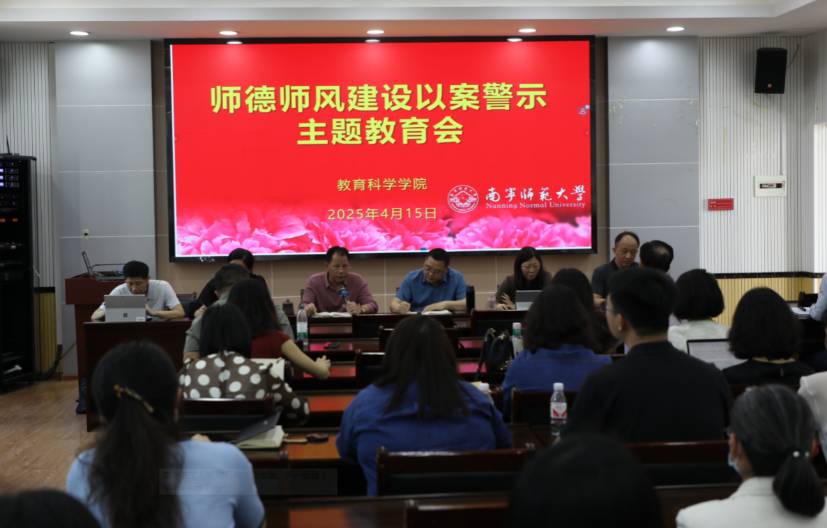 于五合校区理综楼1003会议室召开师德师风以案警示主题教育会。本次会议由学院党委书记余朝文主持,学院领导班子成员及全体教职工参与,围绕师德师风建设工作展开深入研讨与全面部署。