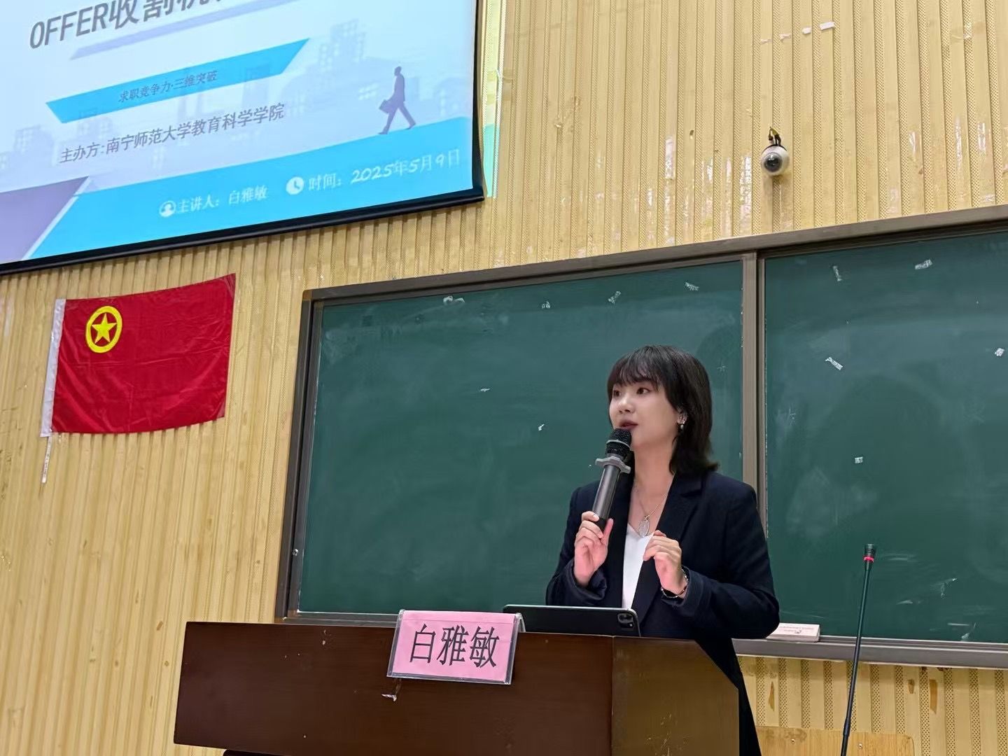 在五综107教室举办了“职途领航,Offer进阶” 主题团日活动,邀请资深职场导师白雅敏担任主讲人,为同学们带来“offer收割机养成计划”。学院党委副书记谢珊老师,学院团委书记,辅导员和兼职辅导员代表参加本次活动。