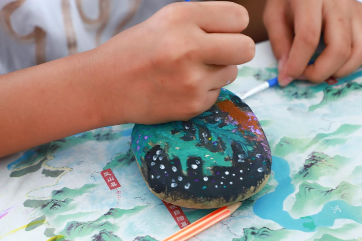 迎着清晨的阳光,天宝村及周围村落的25名学生陆续来到天宝村村委会议室参加夏令营活动。在非遗扎染体验手工课上,志愿者播放教学短片并进行现场示范后,为孩子们系上围兜、分发材料。折叠、扎结、浸染、拆线……当纯白的手帕与束口袋通过颜料晕染出独一无二的图案时,现场响起阵阵惊叹。石头绘画课上,实践队员支起小白板,让同学们在白板上设计要在石头上绘画的图案,再将鹅卵石、五颜六色的颜料、粗细不一的画笔等材料有序分发给每位同学。学生们专注地绘制着,以鹅卵石为画布,用画笔描绘自然与想象。