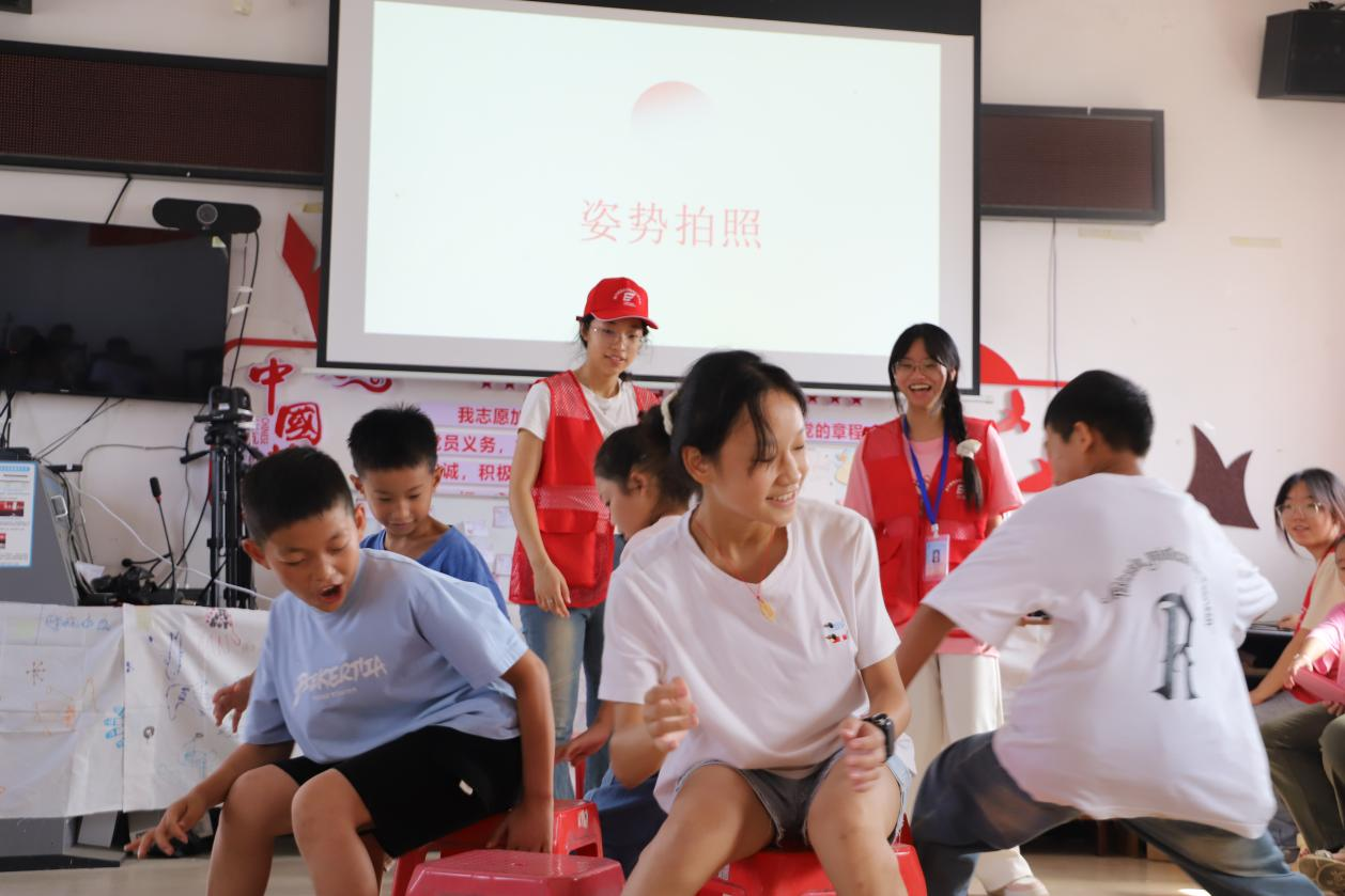 孩子们来齐后,志愿者老师们便带领着同学们紧张有序地排练手势舞《五星出东方》。教室里,师生们全神贯注,力求将最完美的表演呈现出来。排练间隙,为了给同学们带来更多欢乐,营造轻松的氛围,志愿者老师们精心准备了一系列趣味游戏。在“逛三园”游戏中,同学们思维敏捷,快速接答,现场笑声不断。在趣味拍照环节,大家纷纷摆出搞怪又可爱的姿势,用镜头定格美好瞬间,而抢凳子游戏更是将现场气氛推向高潮,同学们你追我赶,充满活力。