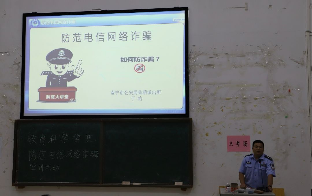 于9月22日晚在五综楼308教室开展了防范电信网络诈骗宣讲警示教育活动,本次活动由南宁市公安局仙葫派出所于佑警官主讲。