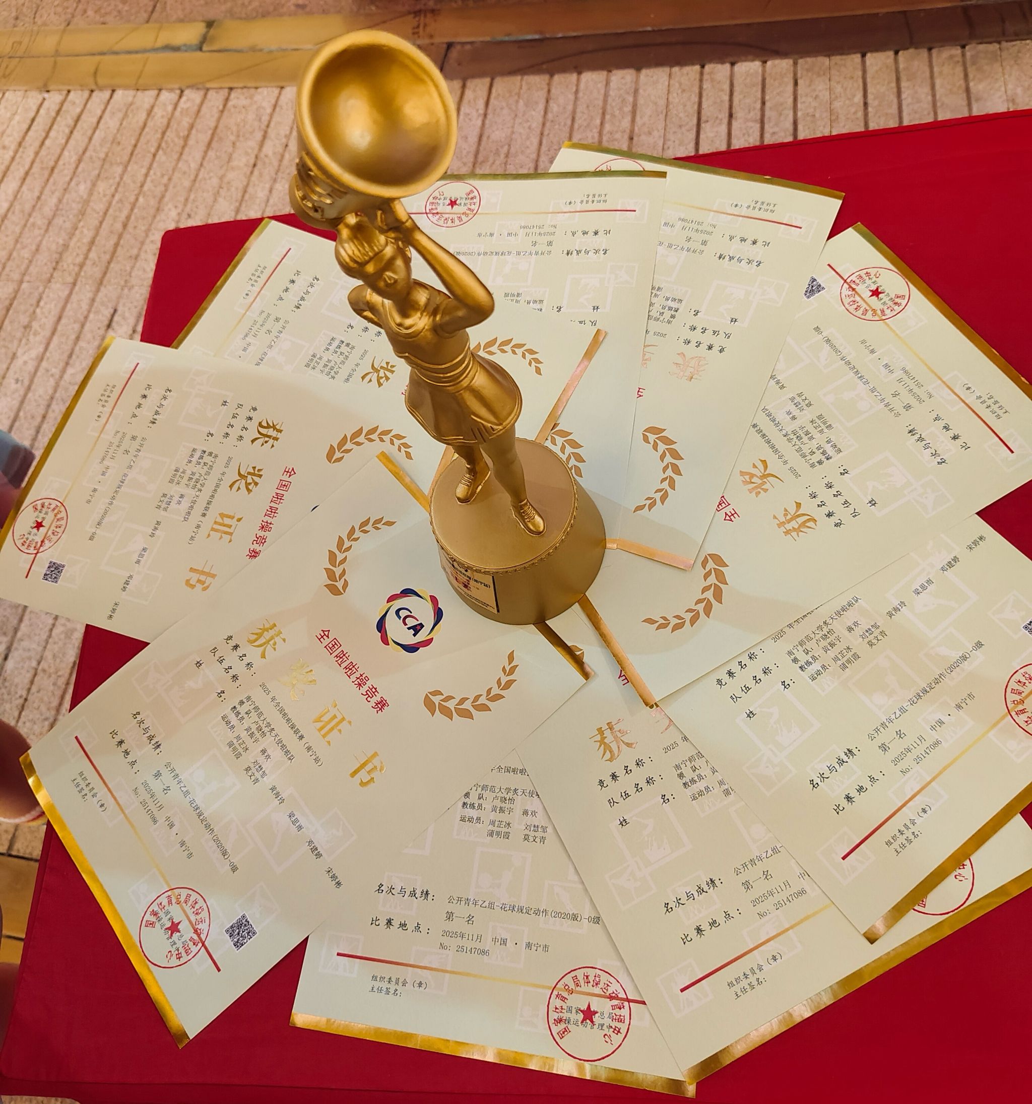 在2025年全国啦啦操联赛(南宁站)中,High漫画 光之翼艺术团啦啦队以高标准、严要求训练队伍,坚持精益求精,运用丰富且具有感染力的表演,配合整齐规范的动作最终荣获公开青年乙组-花球规定动作(2020版)-0级第一名。