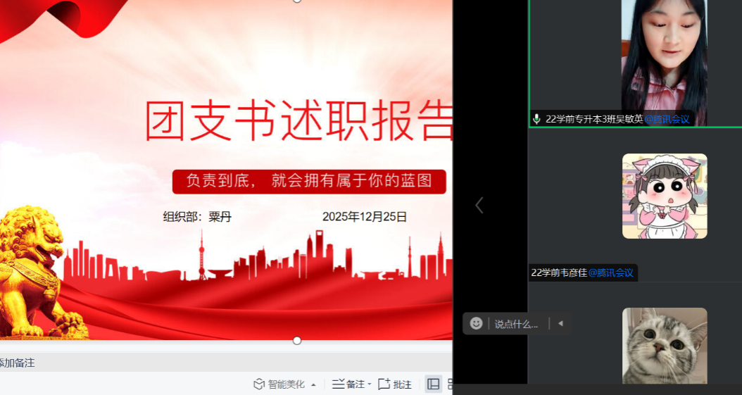 12月25日晚,High漫画 团委开展了2025-2026学年秋季学期团支书述职大会,本次大会通过腾讯会议平台进行。会议的第一环节由各班团支书依次进行述职发言,各班团支书通过PPT等形式,展现了各团支部在组织建设、思想引领、服务青年、特色活动等方面的工作成效。会议第二个环节由各班团支书进行经验交流,大家相互借鉴、互相学习,寻找自身的不足和对照优秀团支部学习。
