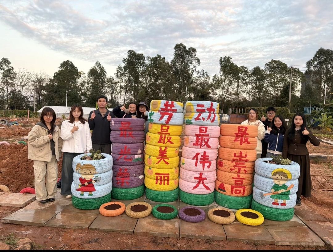 2026年1月6日,实践活动进入多肉种植关键阶段,同学们带着精心设计改造的轮胎造型,有序来到种植区域,开启了“专业+生态+劳动”的实操之旅。同学们运用专业所学,将轮胎造型稳固固定于基地之中,细致铺设无纺布防止土壤流失,科学配比种植土壤、调控湿度,一步步认真完成多肉种植基底的搭建。随后,同学们精心挑选形态各异的多肉品种,小心翼翼地取出植株、梳理根系、栽种培土、轻轻固定。在一双双巧手下,原本冰冷的废旧轮胎摇身一变,成为一个个生机盎然、错落有致的“多肉微花园”,斑驳的轮胎肌理与鲜嫩的多肉叶片相映成趣,构成了校园里一道独特的生态风景线。