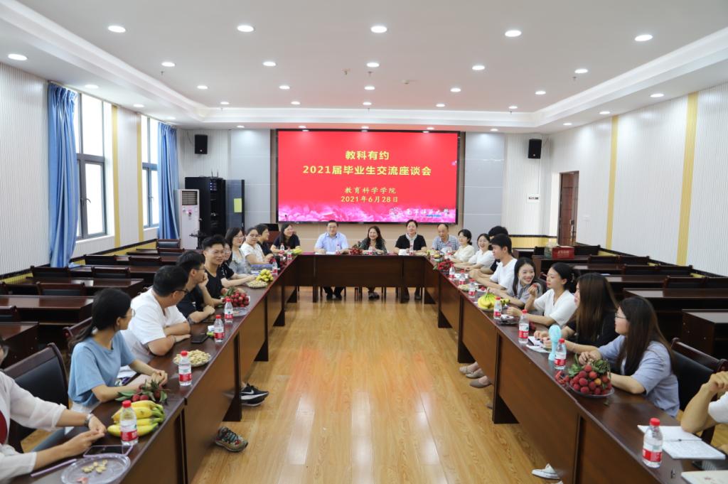 在五合校区理综楼1003会议室举行以“教科有约”为主题的2021届毕业生交流座谈会。学院党委庞芳书记、李强院长、张瑞副院长、徐延宇副院长、学工办老师以及2021届毕业研究生、本科生、毕业生党员代表参加了座谈会。座谈会由谢珊副书记主持。